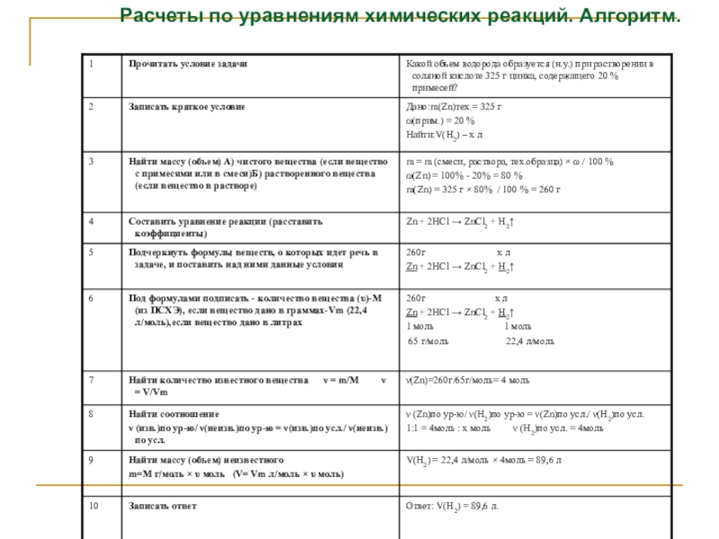 Слайд 4Расчеты по уравнениям химических реакций. Алгоритм.