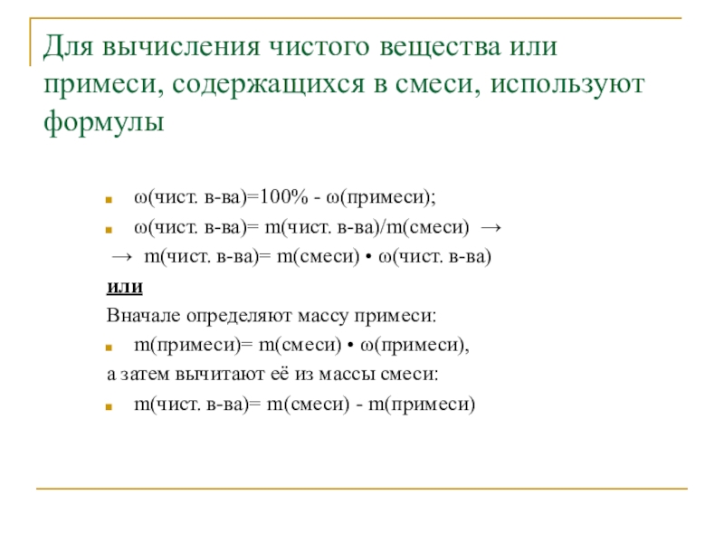 Слайд 5Для вычисления чистого вещества или примеси, содержащихся в смеси, используют формулы