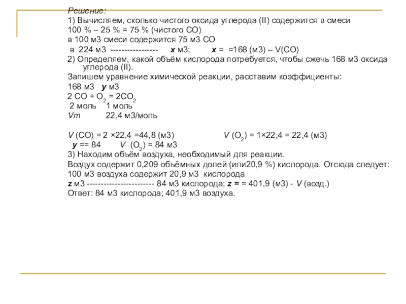 V (CO) = 2 ×22,4 =44,8 (м3) V (O2) = 1×22,4 = 22,4 (м3)