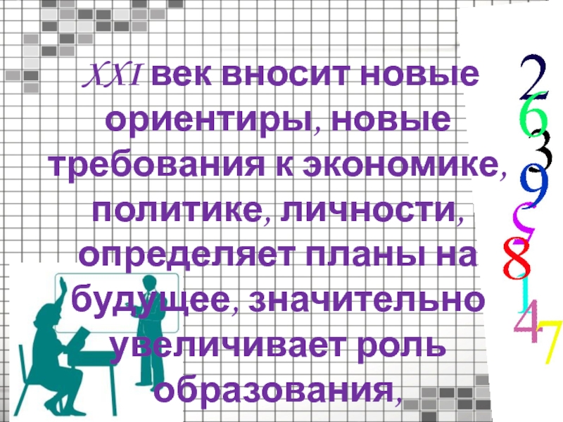XXI век вносит новые ориентиры, новые требования к экономике, политике, личности, определяет планы на будущее, значительно увеличивает роль образования, требует модернизации
