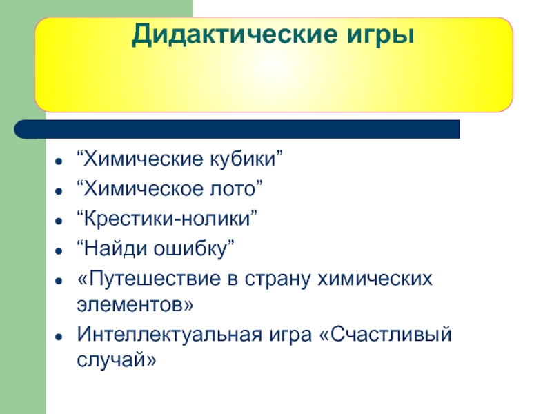 Дидактические игры   “Химические кубики”“Химическое лото”“Крестики-нолики”“Найди ошибку”«Путешествие в страну химических элементов»Интеллектуальная