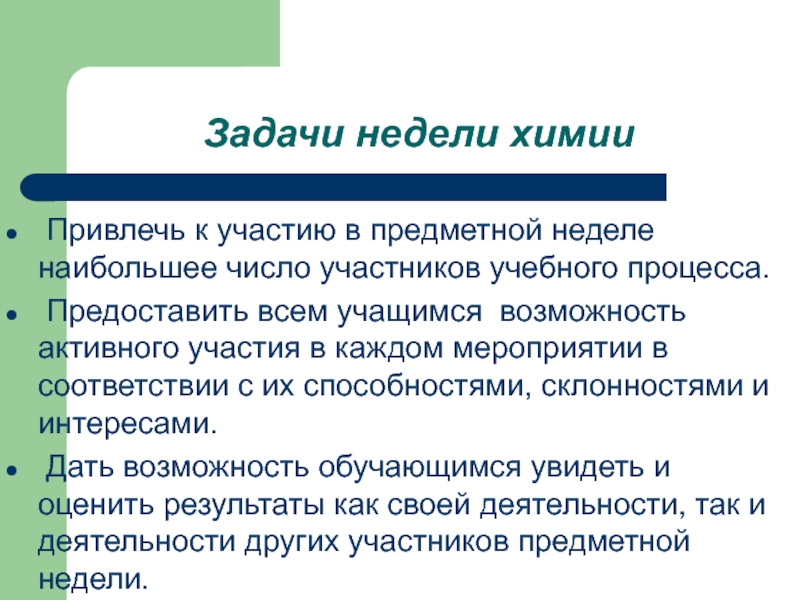 Задачи недели химии Привлечь к участию в предметной неделе наибольшее число участников учебного процесса.