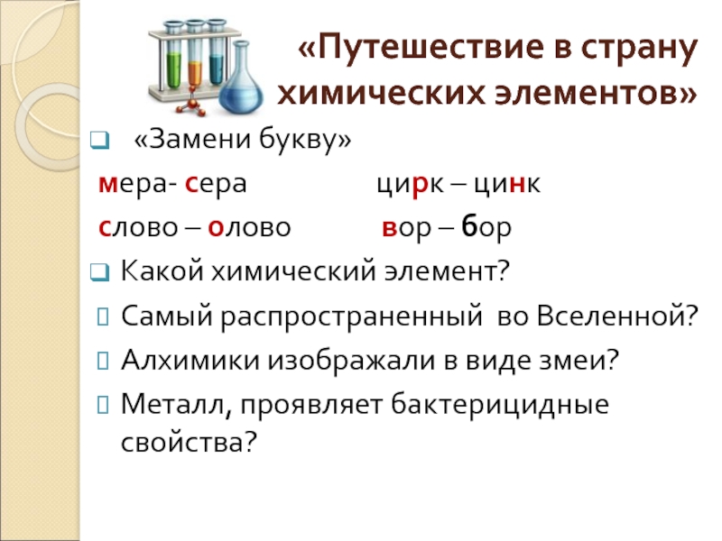 «Путешествие в страну химических элементов» «Замени букву»мера- сера
