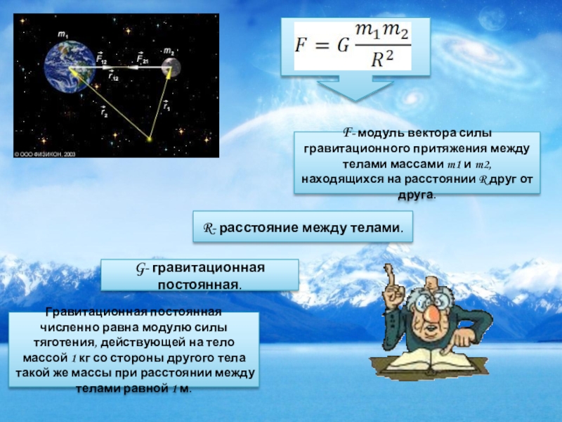 Гравитационная постоянная численно равна модулю силы тяготения, действующей на тело массой 1 кг со стороны другого тела такой же массы при расстоянии между телами равной 1 м.