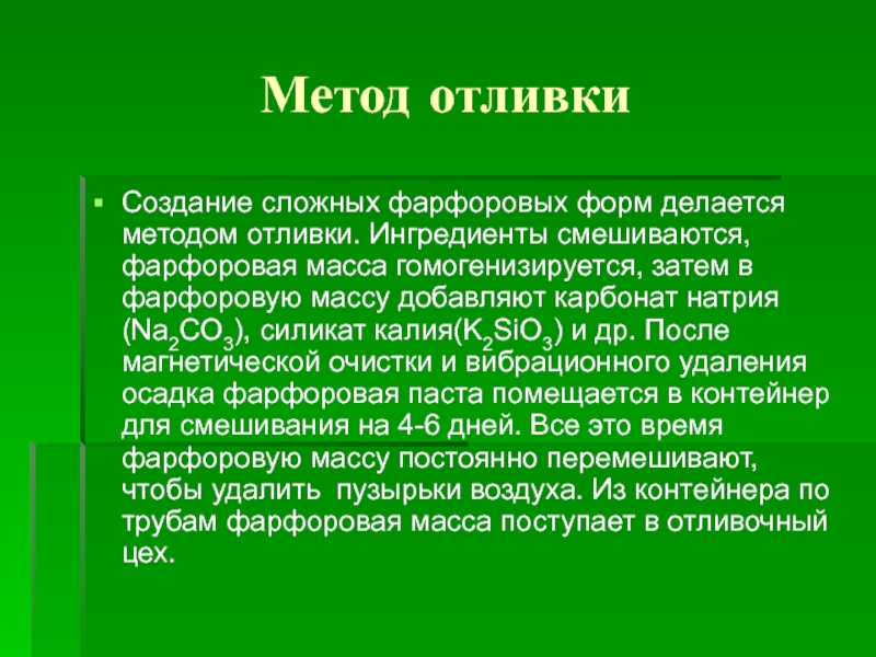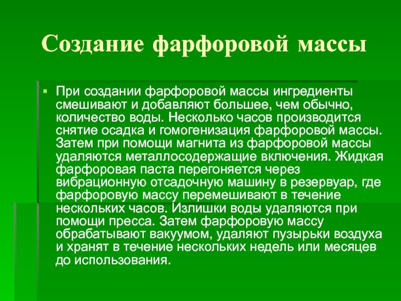 чем обычно, количество воды. Несколько часов производится снятие осадка и гомогенизация фарфоровой массы. Затем при помощи магнита из фарфоровой массы удаляются металлосодержащие включения. Жидкая фарфоровая паста перегоняется через вибрационную отсадочную машину в резервуар, где фарфоровую массу перемешивают в течение нескольких часов. Излишки воды удаляются при помощи пресса. Затем фарфоровую массу обрабатывают вакуумом, удаляют пузырьки воздуха и хранят в течение нескольких недель или месяцев до использования.