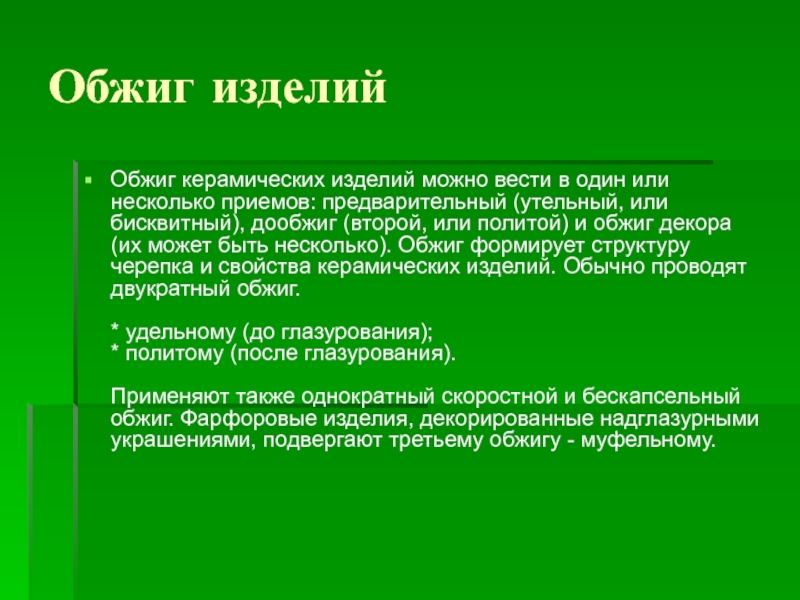 предварительный (утельный, или бисквитный), дообжиг (второй, или политой) и обжиг декора (их может быть несколько). Обжиг формирует структуру черепка и свойства керамических изделий. Обычно проводят двукратный обжиг.