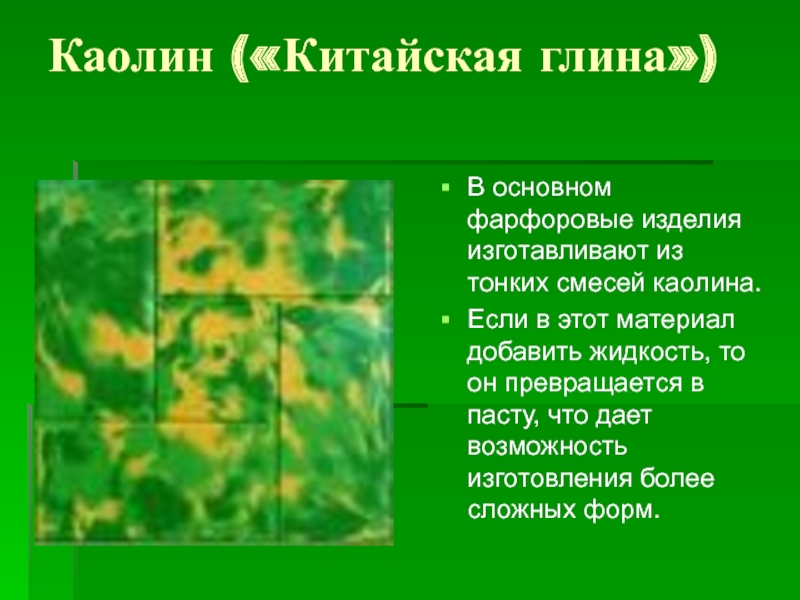 В основном фарфоровые изделия изготавливают из тонких смесей каолина.