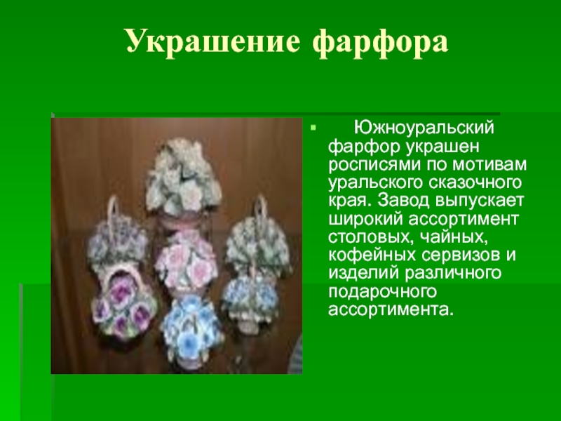 Южноуральский фарфор украшен росписями по мотивам уральского сказочного края.