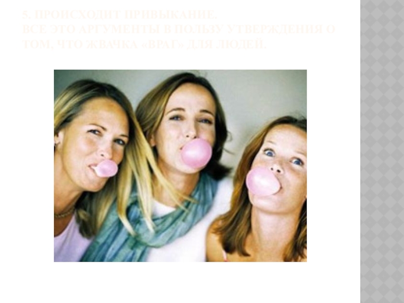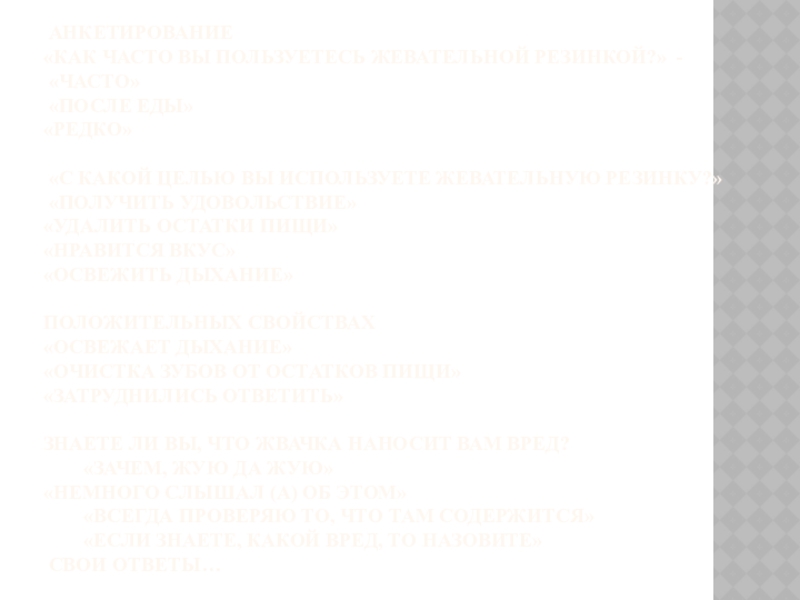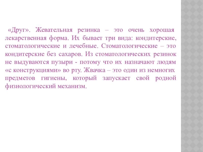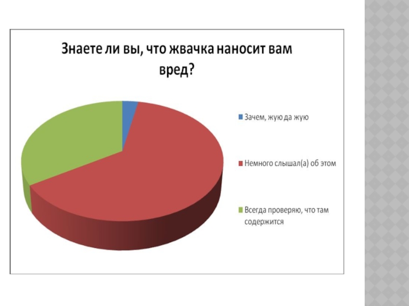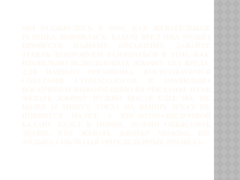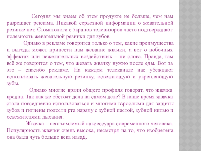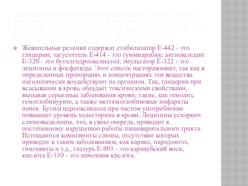 Жевательные резинки содержат стабилизатор Е-442 - это глицерин; загуститель Е-414 - это гуммиарабик; антиоксидант Е-320 - это бутилгидрооксиназол; эмульгатор Е-322 - это лецитины и фосфатиды. Этот список настораживает, так как в определенных пропорциях и концентрациях эти вещества патологически воздействуют на организм. Так, глицерин при всасывании в кровь обладает токсическими свойствами, вызывая серьезные заболевания крови, такие, как гемолиз, гемоглобинурию, а также метгемоглобиновые инфаркты почек. Бутилгидрооксиназол при частом употреблении повышает уровень холестерина в крови. Лецитины ускоряют слюновыделение, что, в свою очередь, приводит к постепенному нарушению работы пищеварительного тракта. Истощаются компоненты слюны, отсутствие которых приводит к таким заболеваниям, как кариес, пародонтоз, гингивиты и т.д., глазурь Е-903 - это карнаубский воск; кислота Е-330 - это лимонная кислота.