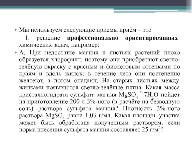 А. При недостатке магния в листьях растений плохо образуется хлорофилл, поэтому они приобретают светло-зелёную окраску с красным и фиолетовым оттенками по краям и вдоль жилок; в течение лета они постепенно желтеют, а потом опадают. На старых листьях между жилками появляются светло-зелёные пятна. Какая масса кристаллогидрата сульфата магния MgSO4 * 7H2O пойдет на приготовление 200 л 3%-ного (в расчёте на безводную соль) раствора сульфата магния? Плотность 3%-ного раствора MgSO4 равна 1,03 г/мл. Какая площадь участка может быть обработана полученным раствором, если норма внесения сульфата магния составляет 25 г/м2?