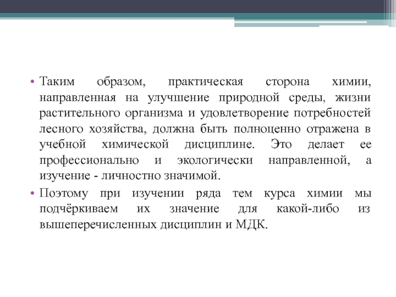 растительного организма и удовлетворение потребностей лесного хозяйства, должна быть полноценно отражена в учебной химической дисциплине. Это делает ее профессионально и экологически направленной, а изучение - личностно значимой.