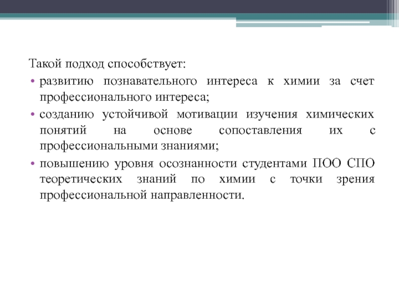 созданию устойчивой мотивации изучения химических понятий на основе сопоставления их с профессиональными знаниями;