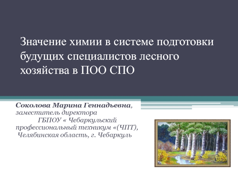 Слайд 1Значение химии в системе подготовки будущих специалистов лесного хозяйства в ПОО