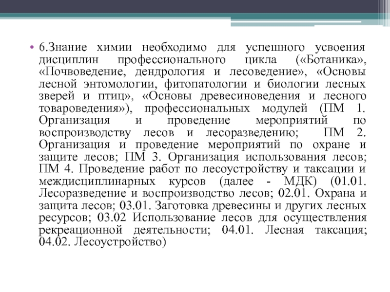дендрология и лесоведение», «Основы лесной энтомологии, фитопатологии и биологии лесных зверей и птиц», «Основы древесиноведения и лесного товароведения»), профессиональных модулей (ПМ 1. Организация и проведение мероприятий по воспроизводству лесов и лесоразведению; ПМ 2. Организация и проведение мероприятий по охране и защите лесов; ПМ 3. Организация использования лесов; ПМ 4. Проведение работ по лесоустройству и таксации и междисциплинарных курсов (далее - МДК) (01.01. Лесоразведение и воспроизводство лесов; 02.01. Охрана и защита лесов; 03.01. Заготовка древесины и других лесных ресурсов; 03.02 Использование лесов для осуществления рекреационной деятельности; 04.01. Лесная таксация; 04.02. Лесоустройство)
