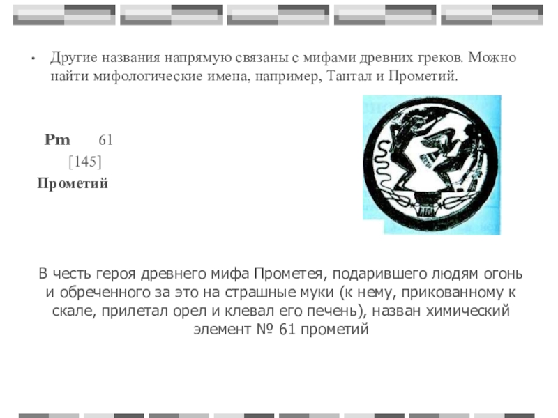 В честь героя древнего мифа Прометея, подарившего людям огонь и обреченного за это на страшные муки (к нему, прикованному к скале, прилетал орел и клевал его печень), назван химический элемент № 61 прометий
