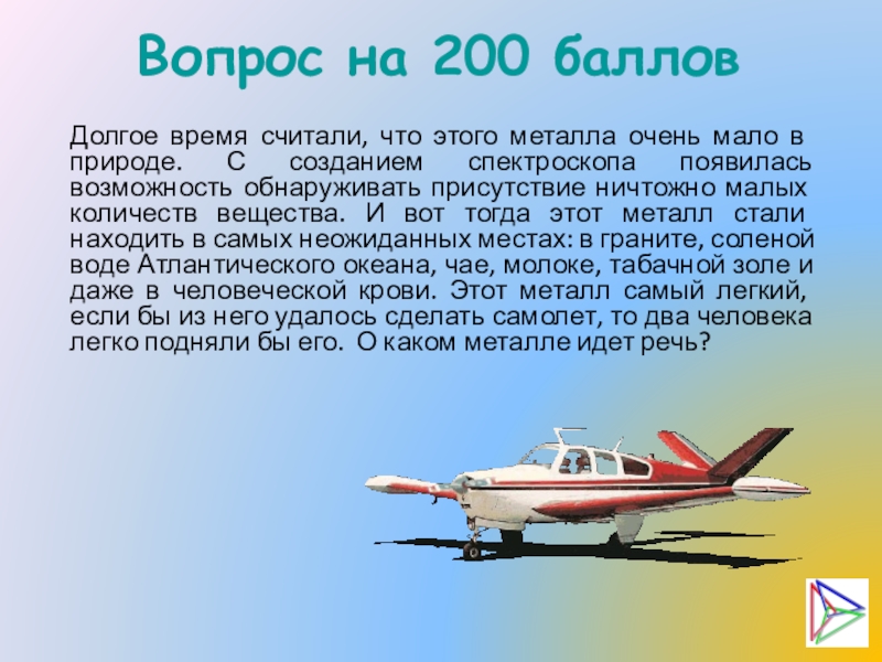 в природе. С созданием спектроскопа появилась возможность обнаруживать присутствие ничтожно малых количеств вещества. И вот тогда этот металл стали находить в самых неожиданных местах: в граните, соленой воде Атлантического океана, чае, молоке, табачной золе и даже в человеческой крови. Этот металл самый легкий, если бы из него удалось сделать самолет, то два человека легко подняли бы его. О каком металле идет речь?