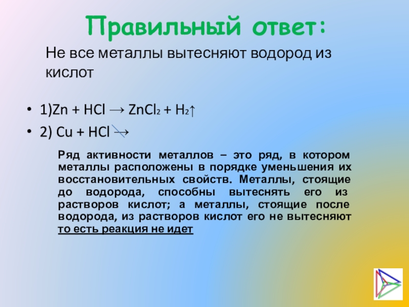 Ряд активности металлов – это ряд, в котором металлы расположены в порядке уменьшения их восстановительных свойств. Металлы, стоящие до водорода, способны вытеснять его из растворов кислот; а металлы, стоящие после водорода, из растворов кислот его не вытесняют то есть реакция не идет