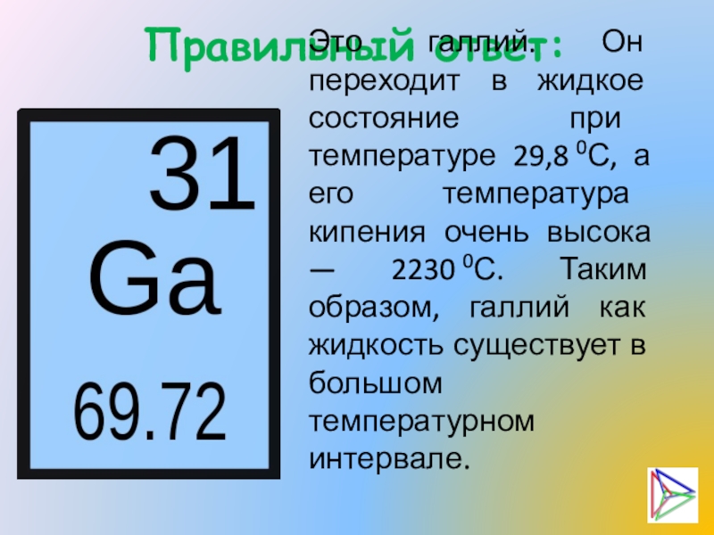 а его температура кипения очень высока — 2230 0С. Таким образом, галлий как жидкость существует в большом температурном интервале.