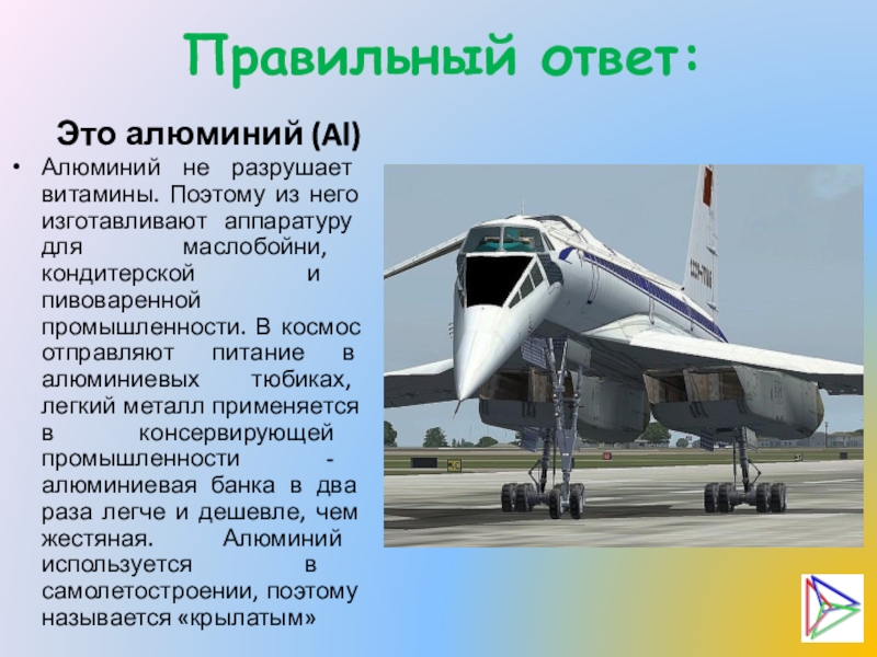 аппаратуру для маслобойни, кондитерской и пивоваренной промышленности. В космос отправляют питание в алюминиевых тюбиках, легкий металл применяется в консервирующей промышленности - алюминиевая банка в два раза легче и дешевле, чем жестяная. Алюминий используется в самолетостроении, поэтому называется «крылатым»
