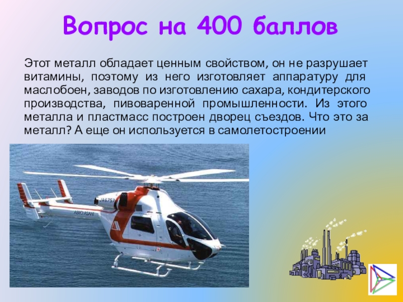 витамины, поэтому из него изготовляет аппаратуру для маслобоен, заводов по изготовлению сахара, кондитерского производства, пивоваренной промышленности. Из этого металла и пластмасс построен дворец съездов. Что это за металл? А еще он используется в самолетостроении