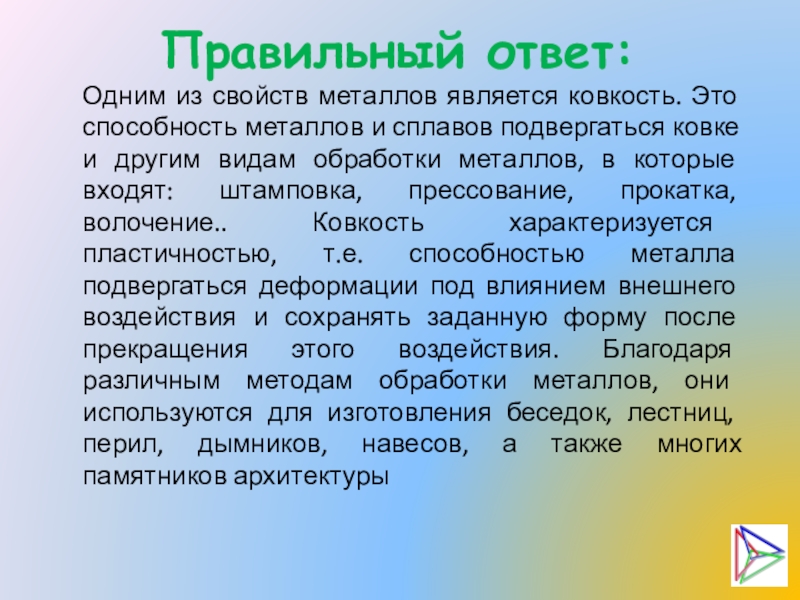 сплавов подвергаться ковке и другим видам обработки металлов, в которые входят: штамповка, прессование, прокатка, волочение.. Ковкость характеризуется пластичностью, т.е. способностью металла подвергаться деформации под влиянием внешнего воздействия и сохранять заданную форму после прекращения этого воздействия. Благодаря различным методам обработки металлов, они используются для изготовления беседок, лестниц, перил, дымников, навесов, а также многих памятников архитектуры