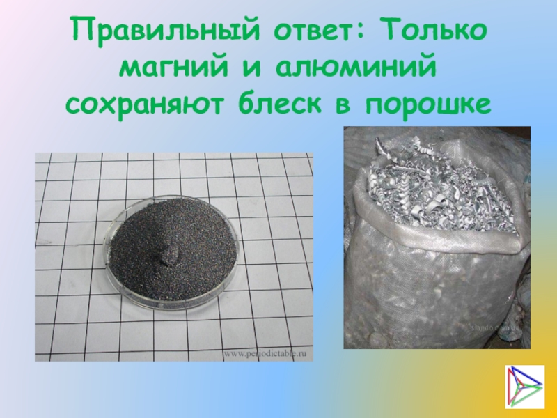 Слайд 17Правильный ответ: Только магний и алюминий сохраняют блеск в порошке