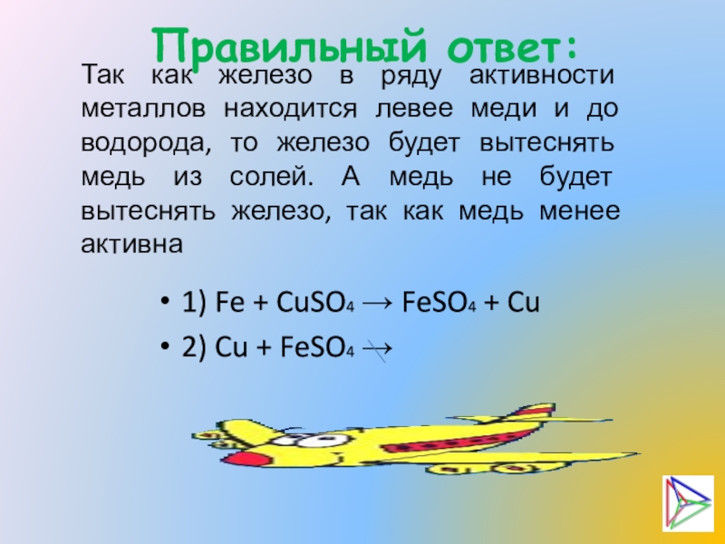 меди и до водорода, то железо будет вытеснять медь из солей. А медь не будет вытеснять железо, так как медь менее активна
