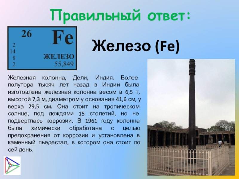 в Индии была изготовлена железная колонна весом в 6,5 т, высотой 7,3 м, диаметром у основания 41,6 см, у верха 29,5 см. Она стоит на тропическом солнце, под дождями 15 столетий, но не подверглась коррозии. В 1961 году колонна была химически обработана с целью предохранения от коррозии и установлена в каменный пьедестал, в котором она стоит по сей день.