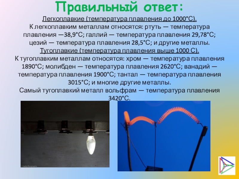 — температура плавления —38,9°С; галлий — температура плавления 29,78°С; цезий — температура плавления 28,5°С; и другие металлы.