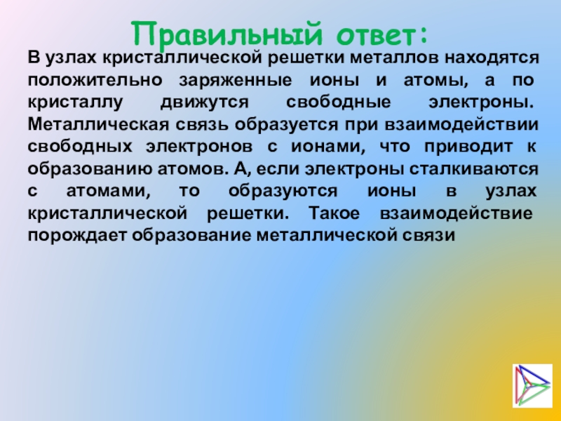 атомы, а по кристаллу движутся свободные электроны. Металлическая связь образуется при взаимодействии свободных электронов с ионами, что приводит к образованию атомов. А, если электроны сталкиваются с атомами, то образуются ионы в узлах кристаллической решетки. Такое взаимодействие порождает образование металлической связи