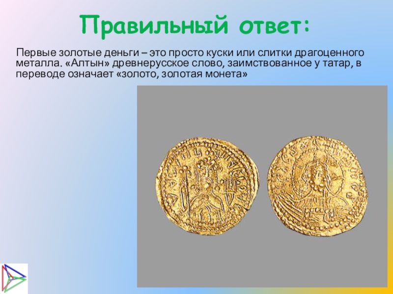 драгоценного металла. «Алтын» древнерусское слово, заимствованное у татар, в переводе означает «золото, золотая монета»