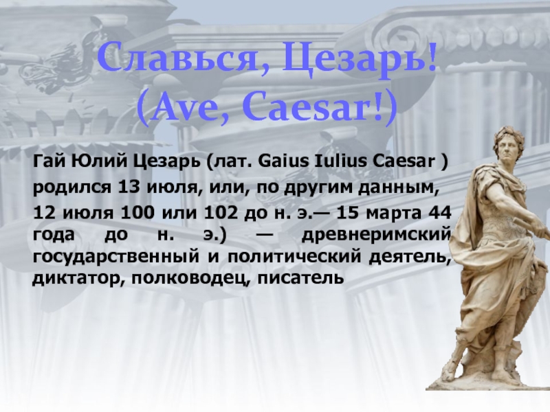 12 июля 100 или 102 до н. э.— 15 марта 44 года до н. э.) — древнеримский государственный и политический деятель, диктатор, полководец, писатель