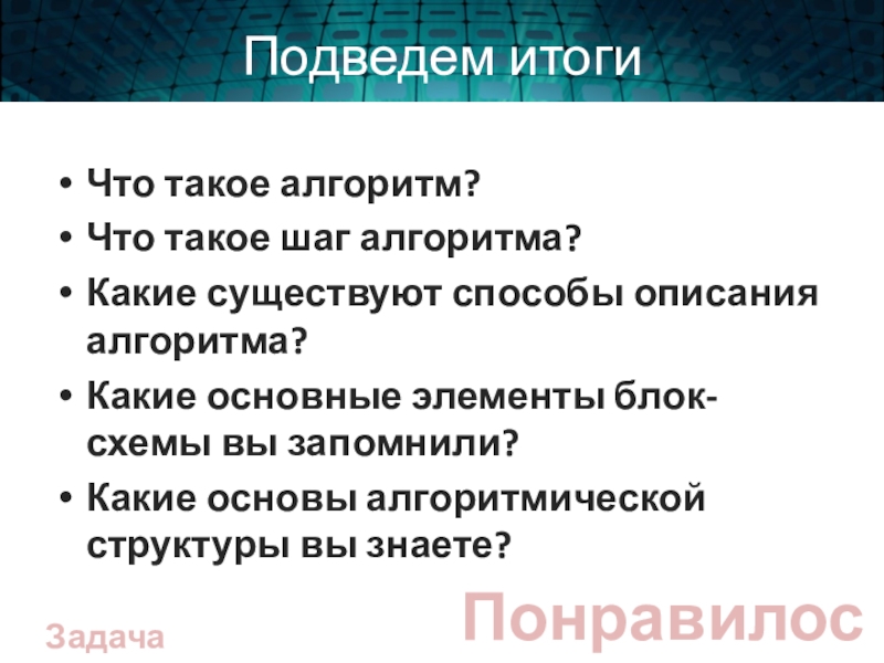 Это сайт презентаций, где можно хранить и обмениваться своими презентациями, докладами, проектами, шаблонами в формате PowerPoint с другими пользователями. Мы помогаем школьникам, студентам, учителям, преподавателям хранить и обмениваться учебными материалами.