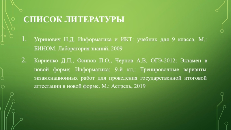 Угринович Н.Д. Информатика и ИКТ: учебник для 9 класса. М.:БИНОМ.