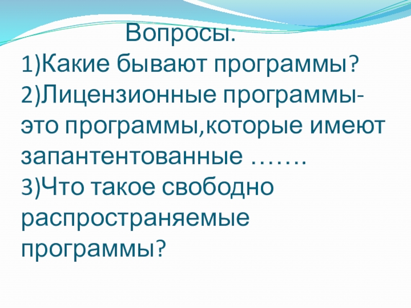 Вопросы. 1)Какие бывают программы? 2)Лицензионные программы-это программы,которые имеют