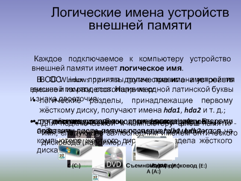 В ОС Windows приняты логические имена устройств внешней памяти, состоящие из одной латинской буквы и знака двоеточия: