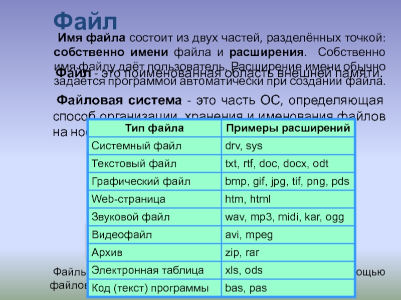 Имя файла состоит из двух частей, разделённых точкой: собственно имени файла и расширения. Собственно имя файлу даёт пользователь. Расширение имени обычно задаётся программой автоматически при создании файла.