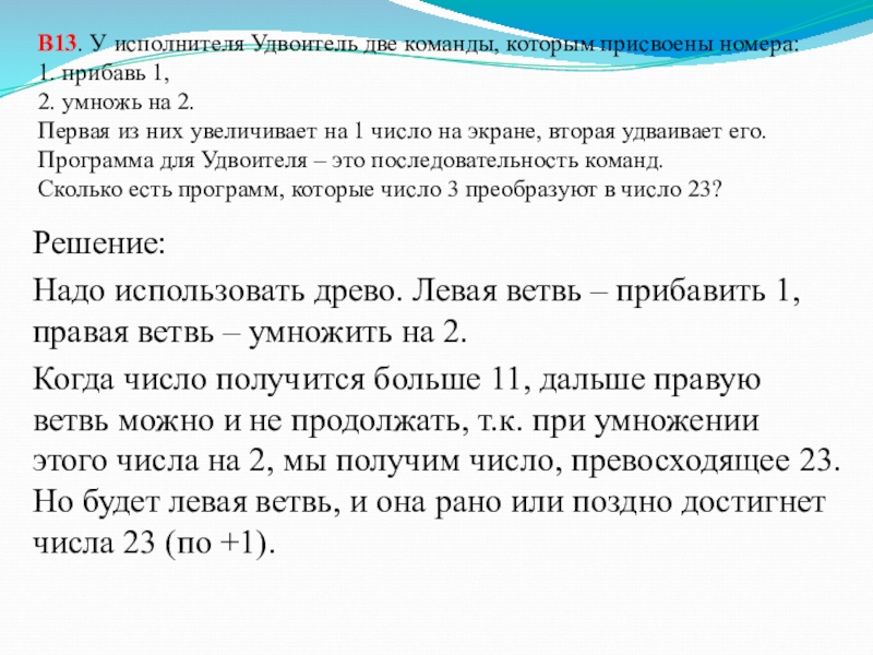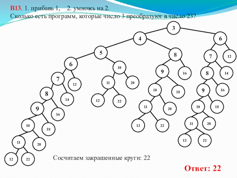 Когда число получится больше 11, дальше правую ветвь можно и не продолжать, т.к. при умножении этого числа на 2, мы получим число, превосходящее 23. Но будет левая ветвь, и она рано или поздно достигнет числа 23 (по +1).