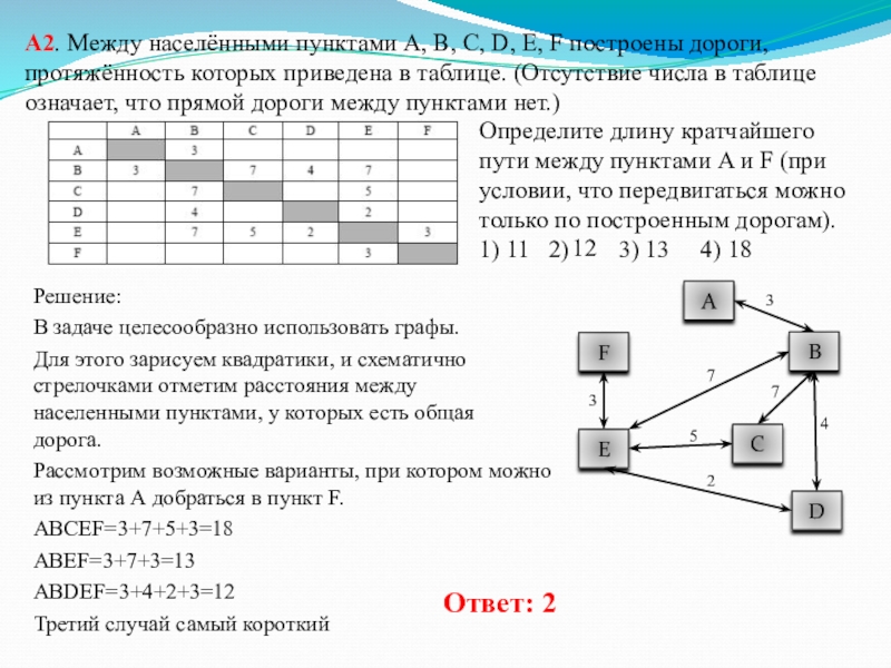 Определите длину кратчайшего пути между пунктами A и F (при условии, что передвигаться можно только по построенным дорогам).