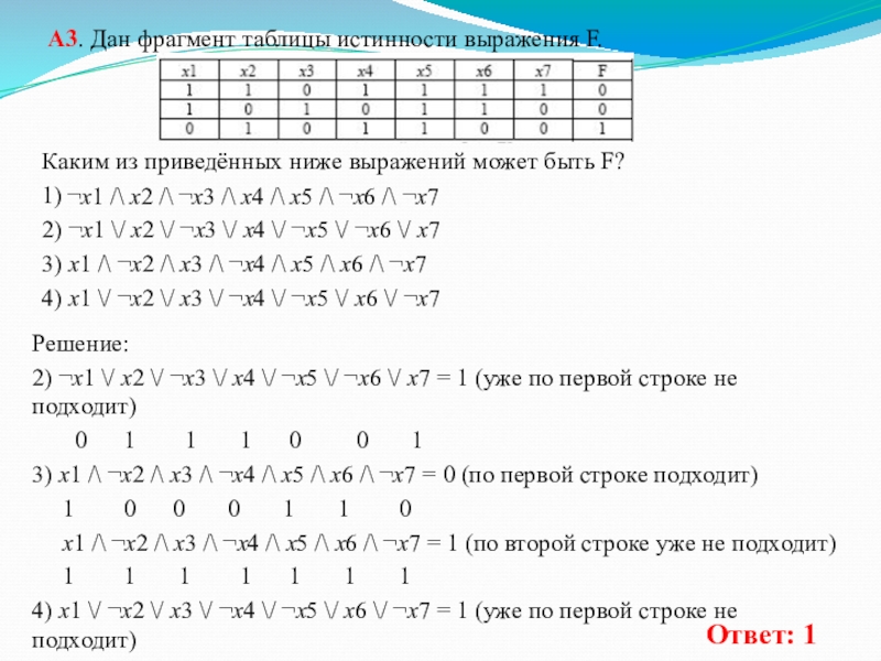 x1 /\ ¬x2 /\ x3 /\ ¬x4 /\ x5 /\ x6 /\ ¬x7 = 1 (по второй строке уже не подходит)