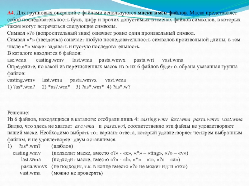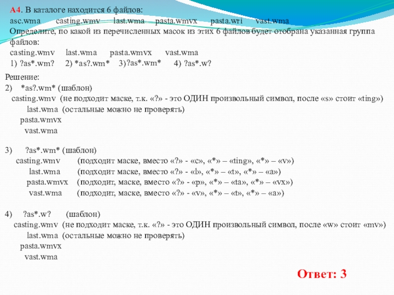 Видно, что здесь не хватает asc.wma и pasta.wri, соответственно эти файлы не удовлетворяют нашей маске. Необходимо выбрать тот вариант ответа, который удовлетворяет четырем выбранным файлам, и не удовлетворяет двум оставшимся.