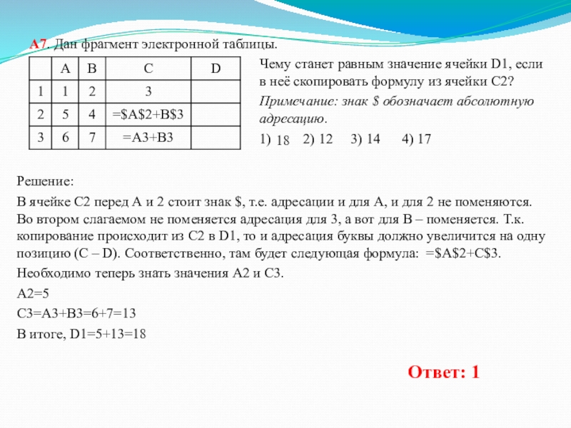 В ячейке С2 перед А и 2 стоит знак $, т.е. адресации и для А, и для 2 не поменяются. Во втором слагаемом не поменяется адресация для 3, а вот для В – поменяется. Т.к. копирование происходит из С2 в D1, то и адресация буквы должно увеличится на одну позицию (С – D). Соответственно, там будет следующая формула: =$A$2+С$3.