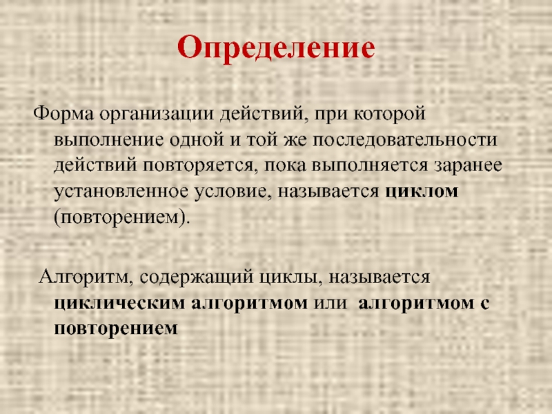ОпределениеФорма организации действий, при которой выполнение одной и той же последовательности действий повторяется, пока выполняется заранее установленное