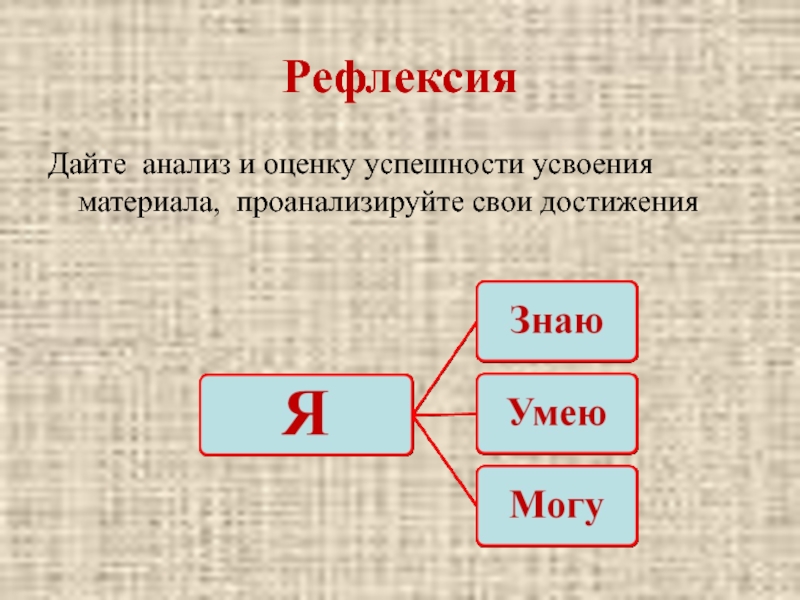 РефлексияДайте анализ и оценку успешности усвоения материала, проанализируйте свои достижения