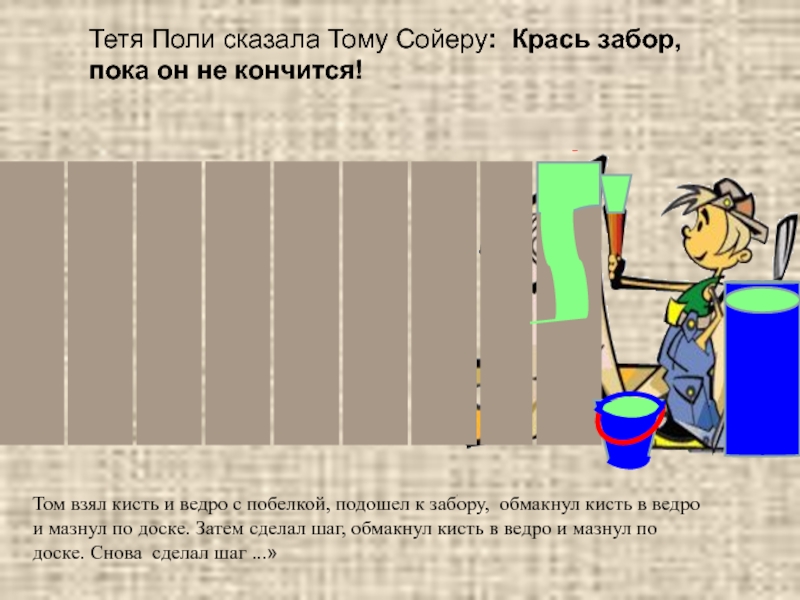 взял кисть и ведро с побелкой, подошел к забору, обмакнул кисть в ведро и мазнул по доске. Затем сделал шаг, обмакнул кисть в ведро и мазнул по доске. Снова сделал шаг ...»