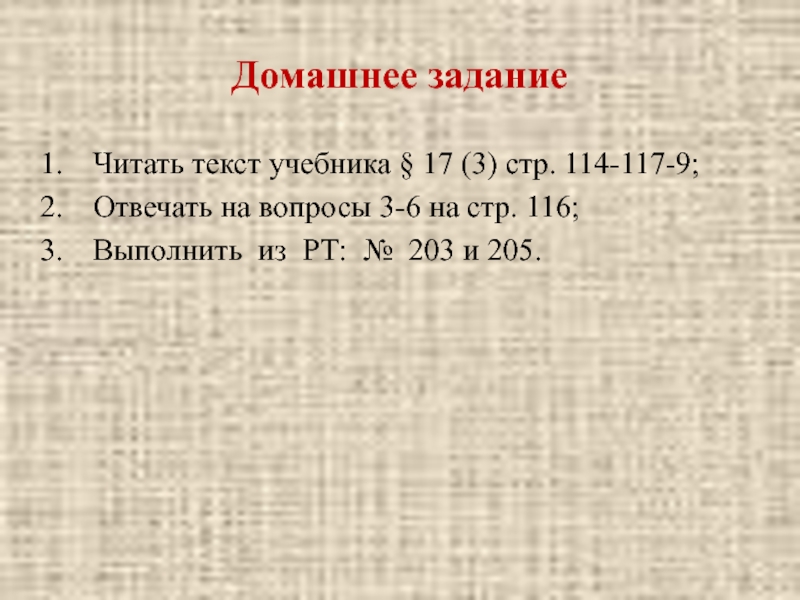 Домашнее заданиеЧитать текст учебника § 17 (3) стр. 114-117-9;Отвечать на вопросы 3-6 на стр. 116;Выполнить из РТ: