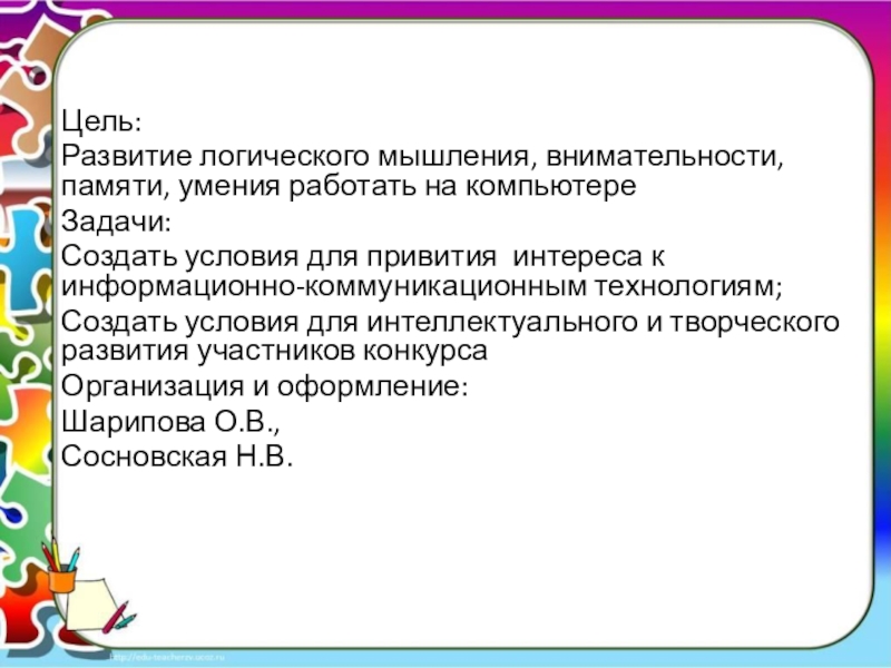 Создать условия для интеллектуального и творческого развития участников конкурса