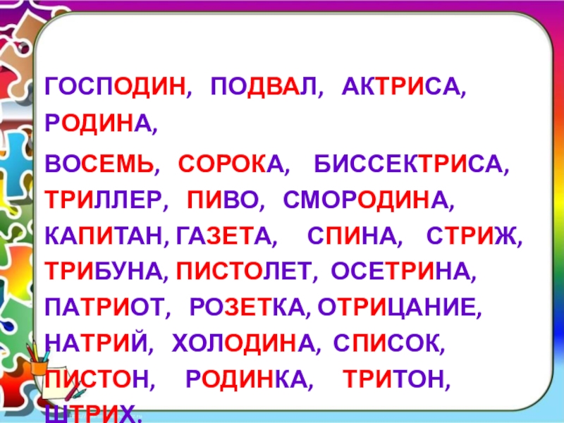 БИССЕКТРИСА, ТРИЛЛЕР, ПИВО, СМОРОДИНА, КАПИТАН, ГАЗЕТА, СПИНА, СТРИЖ, ТРИБУНА, ПИСТОЛЕТ, ОСЕТРИНА, ПАТРИОТ, РОЗЕТКА, ОТРИЦАНИЕ, НАТРИЙ, ХОЛОДИНА, СПИСОК, ПИСТОН, РОДИНКА, ТРИТОН, ШТРИХ.