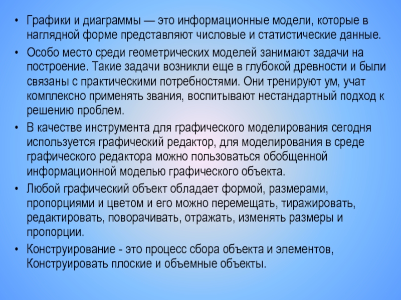 Графические( или геометрические ) информационные модели являются простейшим видом моделей, которые передают внешние признаки объекта -размеры, форму, цвет.