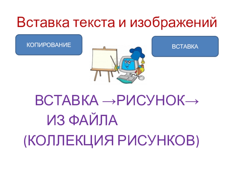 Вставка текста и изображенийКОПИРОВАНИЕВСТАВКА		ВСТАВКА →РИСУНОК→			ИЗ ФАЙЛА 	(КОЛЛЕКЦИЯ РИСУНКОВ)